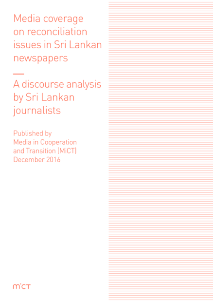 "In order to prepare media based support for reconciliation in Sri Lanka MICT conducted a discourse analysis that investigated media coverage of reconciliation issues in Sri Lankan newspapers. Under the supervision of MICT experts, a mixed group of 16 Tamil and Sinhalese journalists examined all articles related to reconciliation in 9 Sri Lankan newspapers during the month of February 2016. Unsurprisingly, the results of the analysis confirm that newspapers differ significantly in their assessment of events. However, a huge overlap in the selection of topics demonstrates that there are shared interests between the Tamil and Sinhalese media which might provide common grounds for dialogue. In addition, the findings strongly suggest that differences between nationalist and government-supporting Sinhalese media are more far-reaching than differences between Tamil and Sinhalese media." (Publisher description)
