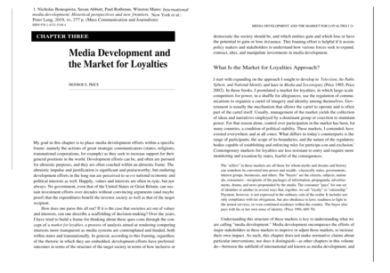 "My goal in this chapter is to place media development efforts within a specific frame: namely the actions of great strategic communicators (states, religions, transnational corporations, for example) as they seek to increase support for their general positions in the world. Development efforts can be, and often are pursued for altruistic purposes, and they are often couched within an altruistic frame. The altruistic impulse and justification is significant and praiseworthy; but enduring development efforts in the long run are perceived to se rve national economic and political interests as well. Happily, values and interests are often in sync, but not always. No government, even that of the United States or Great Britain, can sustain investment efforts over decades without convincing arguments (and maybe proof) that the expenditures benefit the investor society as well as that of the target recipient. How does one parse this all out? If it is the case that societies act out of values and interests, can one describe a scaffolding of decision-making? Over the years, I have tried to build a frame for thinking about these ques tions through the concept of a market for loyalties, a process of analysis aimed at rendering competing interests more transparent as media systems are contemplated and funded, both within states and transnationally. In general, according to this framing, regardless of the rhetoric in which they are embedded, development efforts have preferred outcomes in terms of the structure of the target society in terms of how inclusive or democratic the society should be, and which entities gain and which lose or have the potential to gain or lose influence." (Pages 20-21)