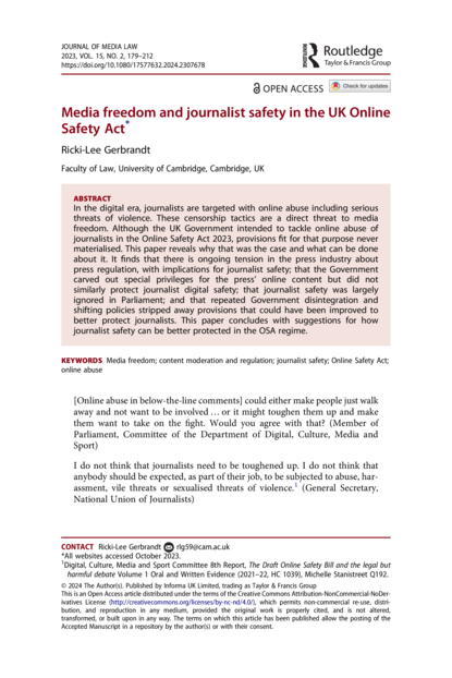 "In the digital era, journalists are targeted with online abuse including serious threats of violence. These censorship tactics are a direct threat to media freedom. Although the UK Government intended to tackle online abuse of journalists in the Online Safety Act 2023, provisions fit for that purpose never materialised. This paper reveals why that was the case and what can be done about it. It finds that there is ongoing tension in the press industry about press regulation, with implications for journalist safety; that the Government carved out special privileges for the press’ online content but did not similarly protect journalist digital safety; that journalist safety was largely ignored in Parliament; and that repeated Government disintegration and shifting policies stripped away provisions that could have been improved to better protect journalists. This paper concludes with suggestions for how journalist safety can be better protected in the OSA regime." (Abstract)