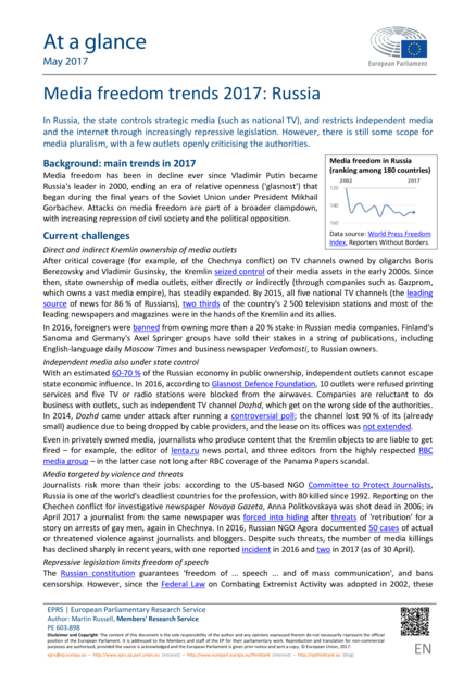 "In Russia, the state controls strategic media (such as national TV), and restricts independent media and the internet through increasingly repressive legislation. However, there is still some scope for media pluralism, with a few outlets openly criticising the authorities." (Page 1)