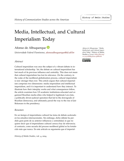 "Cultural imperialism was once the subject of a vibrant debate in international scholarship. Yet, the debate on cultural imperialism has lost much of its previous influence and centrality. This does not mean that cultural imperialism has lost its relevance. On the contrary, in the wake of the neoliberal globalization process, cultural imperialism is now stronger than ever. This article argues that cultural imperialism comprises two dimensions: media imperialism and intellectual imperialism, and it is important to understand how they interact. To illustrate how their interplay works and what consequences follow, the article examines how US academic institutions educated and organized Brazilian media elites who helped to legitimate Lava Jato, a politically driven judicial operation that led to the downgrade of Brazilian democracy, and ultimately paved the way to the rise of Jair Bolsonaro to the presidency." (Abstract)