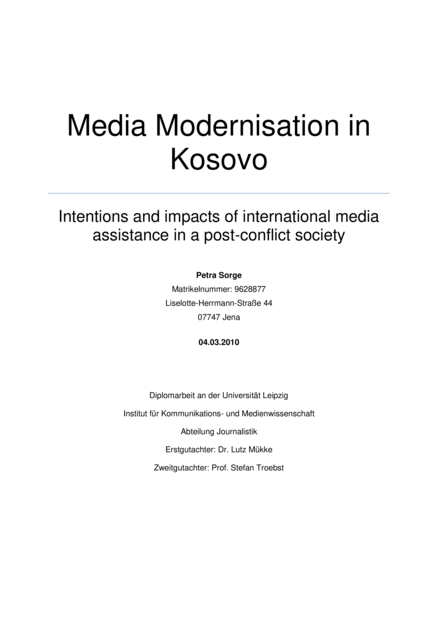 "Nowhere in modern history has media assistance been as concentrated and large in scale as in the case of Kosovo, where under the auspices of the OSCE, different state and non-governmental actors have invested millions in the crisis-ridden media system. This thesis discusses the strategies for media assistance actors in Kosovo and focuses on their outcome by questioning whether the international actors involved have been able to establish a more democratic media system, and questioning which strategies have been successful and which have not. The results are discussed by utilising the theoretical framework of the modernisation theory. The author has interviewed media assistance actors by using two methods: an online survey and face-to-face interviews. In addition, 26 Kosovar journalists, media owners and researchers were questioned in order to evaluate the approach used by the international actors. The findings primarily suggest that media assistance actors have focused too little on economic development in Kosovo and that since the beginning of the international intervention, Kosovar media has never been as fragile and threatened as now." (Abstract)