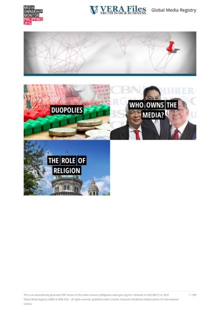 "Two giant broadcast networks dominate the Philippine media industry both in terms of economic market power and audience reach, which gives them a major potential to shape public opinion. Despite a high number of media outlets and being described as one of the most freewheeling media systems in the region, Philippine media continuous to be owned by and to depend on the economic and political elite [...] Five families in the Forbes List of 2016 Philippines’ Richest are in media, four of which made their money predominantly from media. Even though the political and economic elite are interweaved, those links have not led to targeted discriminatory actions in the recent past, with in general little political control being openly exerted. It poses, however, a potential risk to media as soon as the political elite start to exploit the vulnerability of media owners." (http://www.mom-rsf.org)