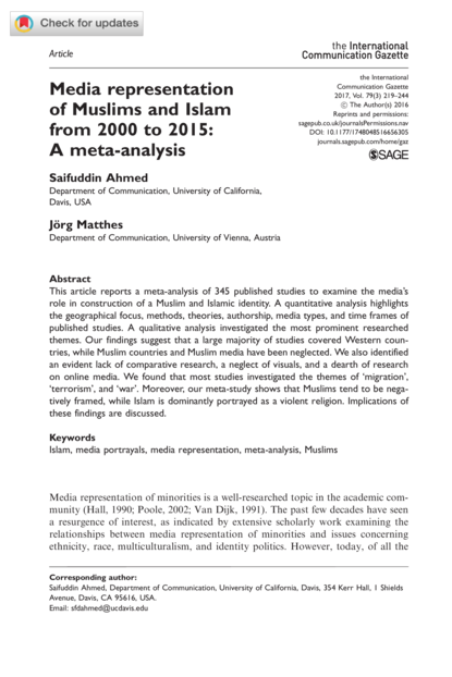 "This article reports a meta-analysis of 345 published studies to examine the media’s role in construction of a Muslim and Islamic identity. A quantitative analysis highlights the geographical focus, methods, theories, authorship, media types, and time frames of published studies. A qualitative analysis investigated the most prominent researched themes. Our findings suggest that a large majority of studies covered Western countries, while Muslim countries and Muslim media have been neglected. We also identified an evident lack of comparative research, a neglect of visuals, and a dearth of research on online media. We found that most studies investigated the themes of ‘migration’, ‘terrorism’, and ‘war’. Moreover, our meta-study shows that Muslims tend to be negatively framed, while Islam is dominantly portrayed as a violent religion. Implications of these findings are discussed." (Abstract)