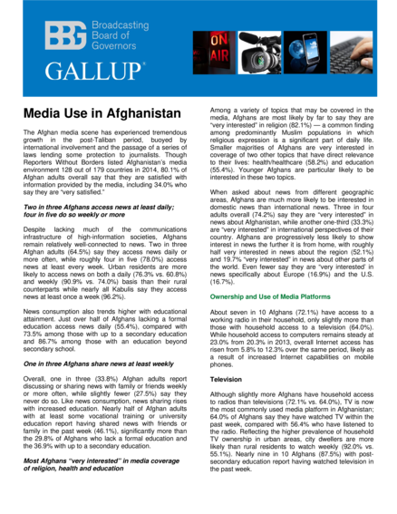 "The Afghan media scene has experienced tremendous growth in the post-Taliban period, buoyed by international involvement and the passage of a series of laws lending some protection to journalists. Though Reporters Without Borders listed Afghanistan’s media environment 128 out of 179 countries in 2014, 80.1% of Afghan adults overall say that they are satisfied with information provided by the media, including 34.0% who say they are “very satisfied." (Page 1)