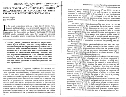 "In the bleak press rights territory of post-Soviet Central Asia, domestic and international nong-overnmental organisations, foreign governments, news outlets, and multinational entities such as the Organization for Cooperation and Security in Europe (OSCE) and UNESCO monitor constraints on the press. They also protest censorship and decry journalists‘arrests, prosecutions, harassment, and murders." (Abstract)