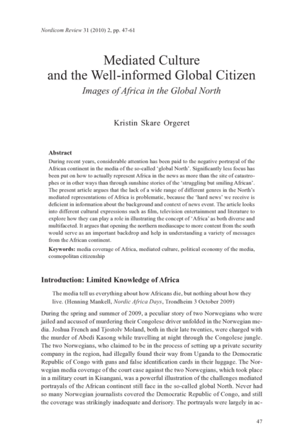 "During recent years, considerable attention has been paid to the negative portrayal of the African continent in the media of the so-called ‘global North’. Significantly less focus has been put on how to actually represent Africa in the news as more than the site of catastrophes or in other ways than through sunshine stories of the ‘struggling but smiling African’. The present article argues that the lack of a wide range of different genres in the North’s mediated representations of Africa is problematic, because the ‘hard news’ we receive is deficient in information about the background and context of news event. The article looks into different cultural expressions such as film, television entertainment and literature to explore how they can play a role in illustrating the concept of ‘Africa’ as both diverse and multifaceted. It argues that opening the northern mediascape to more content from the south would serve as an important backdrop and help in understanding a variety of messages from the African continent." (Abstract)