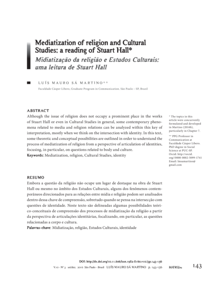 "Although the issue of religion does not occupy a prominent place in the works of Stuart Hall or even in Cultural Studies in general, some contemporary phenomena related to media and religion relations can be analyzed within this key of interpretation, mostly when we think on the intersection with identity. In this text, some theoretic and conceptual possibilities are outlined in order to understand the process of mediatization of religion from a perspective of articulation of identities, focusing, in particular, on questions related to body and culture." (Abstract)