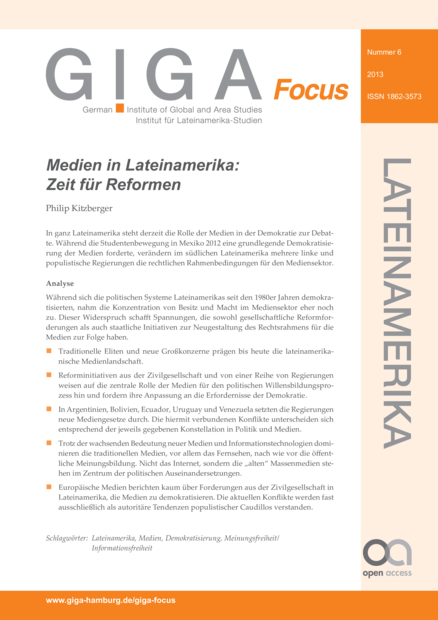 "Während sich die politischen Systeme Lateinamerikas seit den 1980er Jahren demokratisierten, nahm die Konzentration von Besitz und Macht im Mediensektor eher noch zu. Dieser Widerspruch schafft Spannungen, die sowohl gesellschaftliche Reformforderungen als auch staatliche Initiativen zur Neugestaltung des Rechtsrahmens für die Medien zur Folge haben. Traditionelle Eliten und neue Großkonzerne prägen bis heute die lateinamerikanische Medienlandschaft. Reforminitiativen aus der Zivilgesellschaft und von einer Reihe von Regierungen weisen auf die zentrale Rolle der Medien für den politischen Willensbildungsprozess hin und fordern ihre Anpassung an die Erfordernisse der Demokratie. In Argentinien, Bolivien, Ecuador, Uruguay und Venezuela setzten die Regierungen neue Mediengesetze durch. Die hiermit verbundenen Konflikte unterscheiden sich entsprechend der jeweils gegebenen Konstellation in Politik und Medien. Trotz der wachsenden Bedeutung neuer Medien und Informationstechnologien dominieren die traditionellen Medien, vor allem das Fernsehen, nach wie vor die öffentliche Meinungsbildung. Nicht das Internet, sondern die „alten“ Massenmedien stehen im Zentrum der politischen Auseinandersetzungen." (Seite 1)
