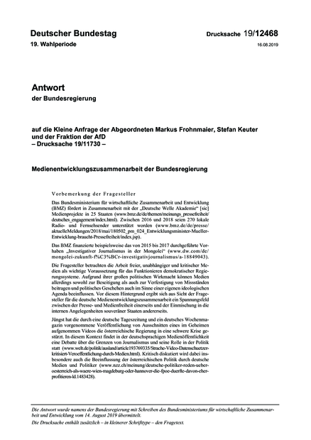 "Die Bundesregierung hat im erfragten Zeitraum [seit 2008] 143 Vorhaben der Deutschen Welle (DW), der Deutsche Welle Akademie (DWA) und der GIZ gefördert bzw. beauftragt, die zum Teil mehrere Einzelmaßnahmen und -aktivitäten umfassen. Das Engagement auf dem Gebiet der Meinungsfreiheit und Medienentwicklung erfolgt in der Regel im Rahmen von Zuwendungen, mit denen auf den jeweiligen lokalen Bedarf ausgerichtete Beratungs- und Trainingsleistungen, etwa in Medienhäusern, umgesetzt werden. Eine unmittelbare Projektbeauftragung erfolgt hierbei nicht." (Seite 2)