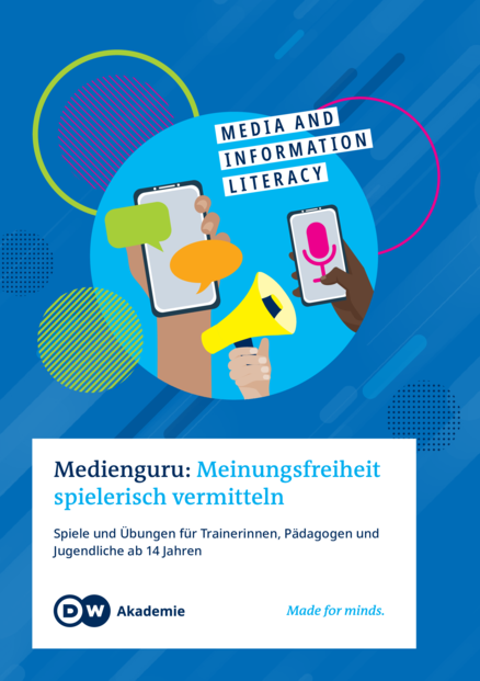 "Wie steht es um die Meinungsfreiheit in der Welt? Wie wirkt sich Zensur auf die Medienlandschaft eines Landes aus? Was muss man beim Teilen von Nachrichten auf Social Media beachten? Und was hat es mit Desinformation und Hate Speech auf sich? Vor allem für junge Menschen gewinnen diese Fragen immer mehr an Bedeutung. Um sich in der heutigen Welt zurechtzufinden, müssen sie mit den unterschiedlichsten Medien sicher und reflektiert umgehen können – sie müssen medienkompetent sein. Die Spiele in dieser Sammlung stärken sie darin, indem sie die aktive Auseinandersetzung mit Medien in einem geschützten Raum fördern. Entstanden sind sie in der praktischen Arbeit der DW Akademie: Als Teil des Medienhauses Deutsche Welle setzen wir uns weltweit für das Recht auf freie Meinungsäußerung ein und unterstützen Menschen darin, kompetent mit Medien umzugehen. Wir laden Sie ein, die hier vorgestellten Spiele in Ihre medienpädagogische Arbeit zu integrieren und sie zu nutzen, um Fragen zu Meinungsfreiheit und Medienkompetenz zu beantworten, Wissen zu vertiefen und zum Nachdenken und Nachforschen anzuregen." (Seite 7)