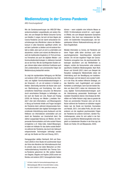 "Während der Corona-Pandemie und der damit verbundenen Einschränkungen des öffentlichen Lebens hat sich der Medienkonsum in allen Bereichen signifikant erhöht. Um auf dem Laufenden und mit anderen in Kontakt zu bleiben, aber auch um sich zu unterhalten und abzulenken, nutzten (und nutzen) die Menschen sowohl die traditionellen Angebote als auch die digitalen Medien- und Kommunikationstechnologien in stärkerem Ausmaß. Medienangebote haben während der Pandemie neben der Informations- auch psychosoziale Funktionen. Die stärker ausgeprägte Nutzung von Medien, die interpersonale Kommunikation und hohe soziale Präsenz ermöglichen (z.B. Video-Calls, Instant-Messenger), ist ein Indikator für das starke soziale Bedürfnis während der Pandemie, das durch den Gebrauch entsprechender Technologien befriedigt werden soll. Neben nützlichen Funktionen können dabei auch eher problematische Folgen der Mediennutzung beobachtet werden. Das Internet wirkt sich beispielsweise in der Krisenzeit positiv als Kommunikationsweg aus, um mit anderen in Kontakt zu bleiben und Informationen zu erhalten. Gleichzeitig berichten die Nutzer aber auch von Überforderung und Erschöpfung sowie negativen emotionalen Auswirkungen durch die Berichterstattung. Mit andauernder Krise zeigen sich zudem Anzeichen dafür, dass weniger Informationen gesucht werden und es bei vielen Menschen zur Informationsüberlastung hinsichtlich des Themas Corona-Pandemie gekommen ist. Wenn subjektiv eine kritische Masse an COVID-19-Informationen erreicht ist, können auch negative Effekte, wie zum Beispiel depressive Symptome, entstehen. Um die psychosozialen Belastungen abzufedern und das Wohlbefinden zu steigern, nutzen die Konsumenten spezifische inhaltliche Medienangebote. So dient zum Beispiel die Rezeption nostalgischer Medieninhalte neben der Unterhaltung auch der Bewältigung von Isolationsbefürchtungen. Als weitere hilfreiche Strategie, um das Bedürfnis nach Zugehörigkeit und sozialen Kontakten zu befriedigen, kann auch die Intensivierung parasozialer Beziehungen mit medialen Charakteren (Prominenten, Personas u.Ä.) dienen. Spezifische Medienangebote können somit auch die Funktion haben, einen Ausgleich zur belastenden Situation in der Krise zu bieten." (https://www.ard-media.de/media-perspektiven)