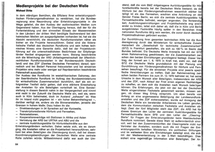 Die Fachstelle hat am 1.6.1975 als eine Abteilung der Deutschen Welle ihre Arbeit aufgenommen; sie untersteht direkt dem Intendanten. Dem Leiter der Fachstelle sind zwei dem technischen Bereich entstammende Mitarbeiter sowie zwei Redakteure, die die Programmseite bei den Projekten steuern, zugeordnet. Es handelt sich dabei um qualifizierte Experten, die über langjährige Auslandserfahrung verfügen, weil sie meist selbst einmal Medienprojekten vorgestanden haben. Die sachlichen und personellen Voraussetzungen dafür, daß die deutsche Medienprojektarbeit in der Zukunft wirksam und phantasievoll abgewickelt wird, sind damit erfüllt. Wie wichtig dieser Sektor für die Entwicklung eines Landes ist, weiß die Bundesregierung; sie würde sonst nicht 8 % ihrer gesamten technischen Hilfe in die Förderung der Massenmedien fließen lassen." (Seite 65-66)