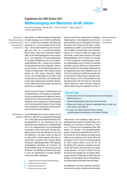 "Die Generation der ab 60-Jährigen weist eine sehr heterogene Mediennutzung auf. Höchste Alltagsrelevanz besitzt das lineare Fernsehen. Während ein Großteil der Senioren regelmäßig online ist, zählt rund jeder Fünfte zu den Offlinern. Es zeigen sich starke Zusammenhänge zwischen soziodemografischen Merkmalen und medialer Teilhabe." (Kurz und kanpp, Seite 389)
