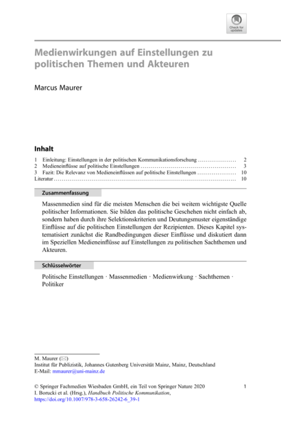 "Massenmedien sind für die meisten Menschen die bei weitem wichtigste Quelle politischer Informationen. Sie bilden das politische Geschehen nicht einfach ab, sondern haben durch ihre Selektionskriterien und Deutungsmuster eigenständige Einflüsse auf die politischen Einstellungen der Rezipienten. Dieses Kapitel systematisiert zunächst die Randbedingungen dieser Einflüsse und diskutiert dann im Speziellen Medieneinflüsse auf Einstellungen zu politischen Sachthemen und Akteuren." (Zusammenfassung)