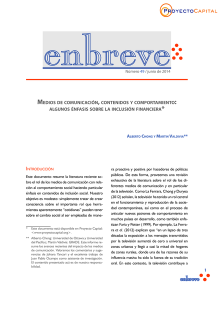 "Este documento resume la literatura reciente sobre el rol de los medios de comunicación con relación al comportamiento social haciendo particular énfasis en contenidos de inclusión social. Nuestro objetivo es modesto: simplemente tratar de crear consciencia sobre el importante rol que herramientas aparentemente “cotidianas” pueden tener sobre el cambio social al ser empleadas de manera proactiva y positiva por hacedores de políticas públicas. De esta forma, proveemos una revisión exhaustiva de la literatura sobre el rol de los diferentes medios de comunicación y en particular de la televisión." (Introducción)