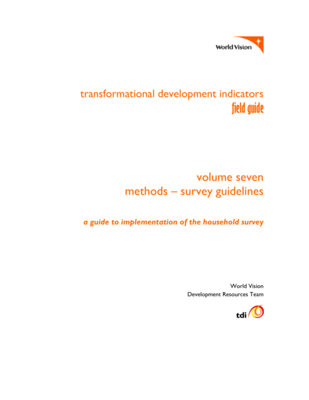 "The objective of the household survey is to measure the transformational development indicators on nutrition, immunization, education, water, diarrhoea management, household resilience, poorest households and HIV/AIDS. Development programs should aim to be able to use this survey method with a level of precision and accuracy for measuring these eight indicators. This volume of the Transformational Development Indicators (TDI) field guide explains, step by step, how to design and implement the TDI household survey. Each step in the process is clearly numbered to assist staff in using this guide. Chapters 1-5 describe the actual process of survey implementation, which includes defining the survey and area to be surveyed, preparation of the questionnaire, determination of sample size and the selection of the sample. There are also sections on data collection and bias inherent with this method. Chapter 6 describes the steps involved in data analysis using the software provided by the Development Resources Team (DeRT). The appendices include additional resources that may be useful for training and learning about household survey method, random sampling. It includes sample questionnaires, as well as a glossary and bibliography of survey literature." (Introduction, page 7)