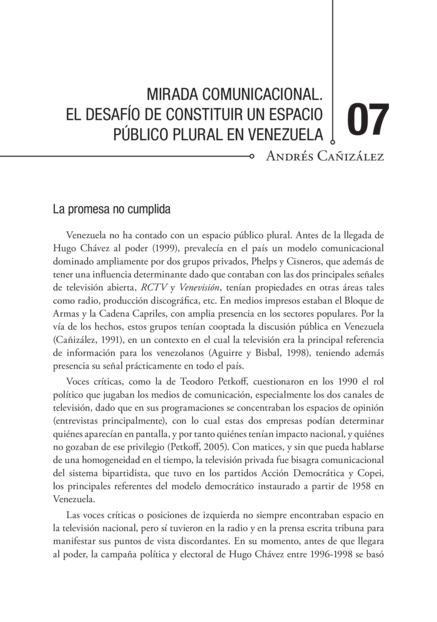 "Desde Venezuela, en pleno siglo XXI, es válida la discusión sobre la necesidad de formular políticas públicas democráticas para las comunicaciones. Partiendo de que cuando se habla de políticas públicas se concibe la posibilidad de prácticas incluyentes, en las que se abra el horizonte de representación diversa en la construcción de lo cultural nacional, y ello en la práctica puede estar garantizado por distintos niveles de participación ciudadana en el proceso de concebir, diseñar y ejecutar planes en el sector comunicacional. Una política pública no podría reducirse, en el contexto actual, a garantizar difusión y ampliar la recepción, que aun cuando pueda ser de mensajes concebidos desde otra óptica cultural serían igualmente unilaterales. Es por ello que coincidimos con diversos autores en resaltar la necesaria activación de ejes que desde los distintos escenarios sociales pasen por la experimentación, la apropiación y la invención por parte de los ciudadanos en una relación dialogante con el universo comunicacional, ya que –hasta ahora– solo han tenido la posibilidad de acceso, en el mejor de los casos. Esto requiere que la comunicación sea desplazada desde los medios hacia la mediación y reconocimiento sociales, como sostenía Martín Barbero, fallecido en 2021. Hoy diremos que debe ser entendida más allá de las redes sociales tecnológicas para llevarlas a verdaderas redes sociales de diálogo entre los ciudadanos. Con esta concepción democrática de políticas públicas debemos considerar que cuando hablamos de sociedad hablamos de un conglomerado plural, en el que se incluyen el Estado y sus instituciones, las y los ciudadanos, el mercado y las empresas privadas, el mundo comunicacional comunitario y universitario, así como los partidos, movimientos y organizaciones sociales." (Páginas 197-198)
