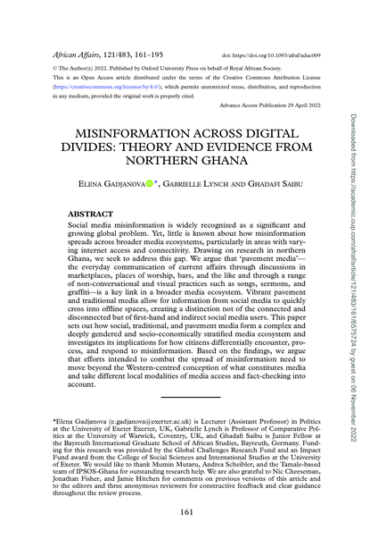 "Social media misinformation is widely recognized as a significant and growing global problem. Yet, little is known about how misinformation spreads across broader media ecosystems, particularly in areas with varying internet access and connectivity. Drawing on research in northern Ghana, we seek to address this gap. We argue that ‘pavement media’—the everyday communication of current affairs through discussions in marketplaces, places of worship, bars, and the like and through a range of non-conversational and visual practices such as songs, sermons, and graffiti—is a key link in a broader media ecosystem. Vibrant pavement and traditional media allow for information from social media to quickly cross into offline spaces, creating a distinction not of the connected and disconnected but of first-hand and indirect social media users. This paper sets out how social, traditional, and pavement media form a complex and deeply gendered and socio-economically stratified media ecosystem and investigates its implications for how citizens differentially encounter, process, and respond to misinformation. Based on the findings, we argue that efforts intended to combat the spread of misinformation need to move beyond the Western-centred conception of what constitutes media and take different local modalities of media access and fact-checking into account." (Abstract)