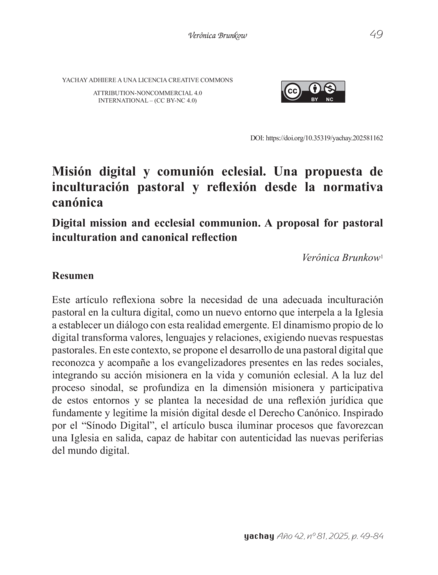 "Este artículo reflexiona sobre la necesidad de una adecuada inculturación pastoral en la cultura digital, como un nuevo entorno que interpela a la Iglesia a establecer un diálogo con esta realidad emergente. El dinamismo propio de lo digital transforma valores, lenguajes y relaciones, exigiendo nuevas respuestas pastorales. En este contexto, se propone el desarrollo de una pastoral digital que reconozca y acompañe a los evangelizadores presentes en las redes sociales, integrando su acción misionera en la vida y comunión eclesial. A la luz del proceso sinodal, se profundiza en la dimensión misionera y participativa de estos entornos y se plantea la necesidad de una reflexión jurídica que fundamente y legitime la misión digital desde el Derecho Canónico. Inspirado por el “Sínodo Digital”, el artículo busca iluminar procesos que favorezcan una Iglesia en salida, capaz de habitar con autenticidad las nuevas periferias del mundo digital." (Resumen)