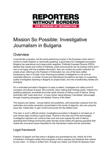 This said, in such a difficult context, investigative journalism in Bulgaria is not dead yet. It even shows signs of being in good shape. Thanks to the wise use of the technologies, investigative reporters can continue their work and even bypass the wall of silence, spreading their findings among the public through social media and gaining popularity that makes the uncovered issues ineludible for the mainstream media and the authorities." (Page 1)