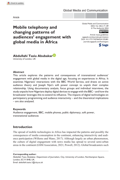 "This article explores the patterns and consequences of transnational audiences’ engagement with global media in the digital age, focusing on experiences in Africa. It examines Nigerians’ interactions with the BBC World Service, and draws on active audience theory and Joseph Nye’s soft power concept to unpick their complex relationship. Using documentary analysis, focus groups and individual interviews, the study unpacks how Nigerians deploy digital devices to engage with the BBC – and how the broadcaster leverages this to extend its influence. The impacts of digital technologies on participatory programming and audience interactivity – and the theoretical implications – are also analysed." (Abstract)