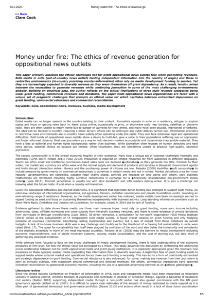"This paper critically assesses the ethical challenges not-for-profit oppositional news outlets face when generating revenues. Both media in exile (out-of-country news outlets feeding independent information into the country of origin) and those in restrictive environments (in-country providing counter-information) often rely on media development funding to survive. Yet they are increasingly expected to diversify revenue as they wean themselves off grant dependency. As a result, tension arises between the necessities to generate revenues while continuing journalism in some of the most challenging environments globally. Building on empirical data, the author reflects on the ethical implications of three main revenue categories being used: grant funding, commercial revenues and donations. The paper finds oppositional news organisations are faced with a unique set of pragmatic challenges that prompts an ethical value set which oscillates between entrenched dependence on grant funding, commercial reluctance and commercial reconciliation." (Abstract)