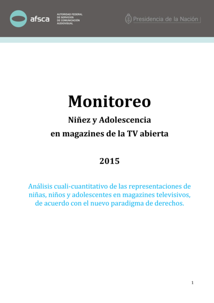 "Los programas de interés general dedicaron un 27,2% de su programación a la presentación de temas que involucran a niñas, niños y adolescentes. Sin embargo, esta presencia notablemente alta en los ciclos del género no implica necesariamente un tratamiento positivo, una participación activa y un rol como sujetos de derecho, tal como se propone desde la Convención de los Derechos del Niño –Ley 23.849– y desde la Ley 26.061. En efecto, al profundizar en las modalidades en que son abordados los segmentos, se advierte que durante la mitad de ese tiempo de programación NNyA son representados/as mediante aspectos negativos." (Conclusiones, página 71)