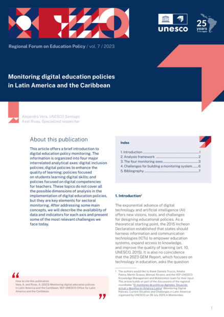 "This article offers a brief introduction to digital education policy monitoring. The information is organized into four major interrelated analytical axes: digital inclusion policies; digital policies to enhance the quality of learning; policies focused on students learning digital skills; and policies focused on digital competencies for teachers. These topics do not cover all the possible dimensions of analysis in the implementation of digital education policies, but they are key elements for sectoral monitoring. After addressing some main concepts, we will describe the availability of data and indicators for each axis and present some of the most relevant challenges we face today." (About this publication)