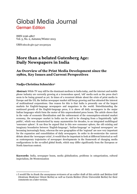 "The Indian newspaper market still keeps growing and has attracted the interest of multinational corporations. One reason for this is that India is presently one of the largest markets for English-language newspapers and magazines in the world. Notwithstanding the continued growth of the English-language press, it is above all daily newspapers in the major Indian languages which form the motor of this unprecedented press boom. The article shows that in the wake of economic liberalization and the enforcement of the consumption-oriented market economy, the newspaper market in India can be said to be changing from a linguistically ‘split public’, which was characterized by many asymmetries for decades, to an integrated multilingual ‘consumer sphere’. It can thus be argued that in this new consumer sphere, the old existing and imaginary boundaries between ‘English-language’, ‘Indian-language’ or ‘regional newspapers’ are becoming increasingly fuzzy, whereas the new geographies of the ‘regional’ are now very important for the expansion and consolidation of daily newspapers." (Abstract)