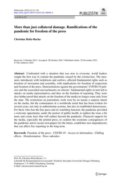 "Confronted with a situation that was new to everyone, world leaders sought the best way to contain the pandemic caused by the coronavirus. The measures introduced, with lockdowns and curfews, affected fundamental rights such as freedom of movement and assembly, with implications for freedom of expression and freedom of the press. Demonstrations against the governments’ COVID-19 policies and the associated encroachments on citizens’ fundamental rights in turn led to attacks on media representatives and thus on the freedom of reporting. They were also further proof that attacks on the freedom of the media no longer come only from the state. The restrictions on journalistic work were by no means a surprise attack on the media, but the continuation of a worldwide trend that has been evident for several years, not only in authoritarian systems, but also in established democracies. For those who fear the free press and its watchdog function, the pandemic provided a welcome opportunity, under the pretext of public health, to tighten the reins a bit more and create facts that will endure beyond the pandemic. Financial support for the media, especially the printed press, to cushion the economic consequences of the pandemic and to secure newspapers for the future, establishes new dependencies that can affect free reporting in the long term." (Abstract)
