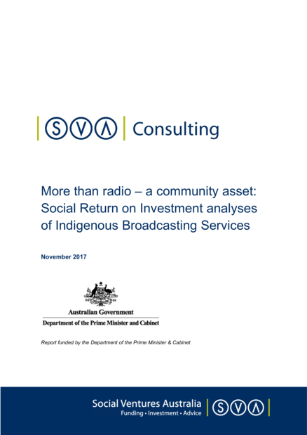 "There are over 120 Australian Government funded Indigenous Broadcasting Services (IBSs) operating in Australia, with further unfunded IBS transmission sites. They vary in size from very small remote services to large community radio broadcasting services, and together, they reach an estimated audience of at least 100,000 Indigenous listeners who listen regularly. The most substantial investment in Indigenous broadcasting is provided by the Culture and Capability Programme under the Indigenous Advancement Strategy (IAS) which is administered by the Department of the Prime and Minister and Cabinet (PM&C). The purpose of this project was to forecast the return on investment over three years of a very remote, regional and urban IBS by understanding, estimating and valuing their impact on stakeholders. The analysis was verified through broader sector consultation to inform the Australian Government about the breadth and depth of impact likely to occur as a result of their continued investment in IBSs [...] We have identified six key insights from the analyses, explored in detail in section 7 of this report: