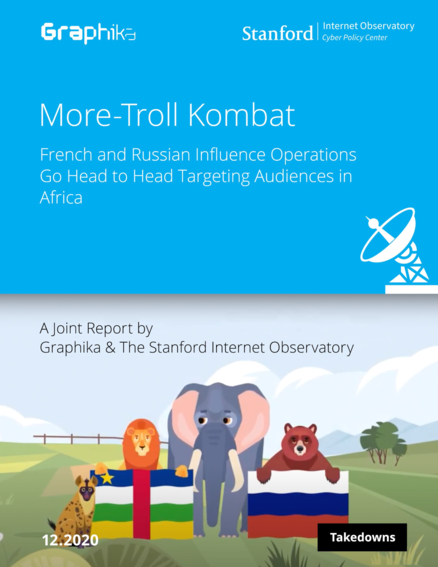 "On December 15, Facebook announced that it had taken down three separate networks that it had discovered for “coordinated inauthentic behavior” that targeted communities across Africa. One, centered on the Central African Republic (CAR) and Mali, was linked to individuals associated with the French military. The other two, centered respectively on CAR and Libya, were connected to the business and influence operations of Russian oligarch Yevgeniy Prigozhin, founder of the mercenary organization Wagner Group and the Internet Research Agency “troll farm.” The French and Russian operations in the CAR tried to expose each other, and repeatedly clashed in groups, comments, and cartoon wars. We have documented the first of the Russian operations in a joint report with Stanford University entitled “Stoking Conflict by Keystroke”; this report focuses on the French and Russian operations that targeted CAR. For the sake of brevity, the operation linked to individuals with ties to the French military will be referred to as the “French operation” in this report, while the Russian operation attributed to individuals associated with past activity by the Internet Research Agency (IRA) and previous operations attributed to entities associated with Russian financier Yevgeniy Prigozhin is referred to as the “Russian operation” in this report. It is worth highlighting that Facebook did not attribute the operation directly to the French Government or the French military, and that this report similarly does not offer evidence of institutional involvement from French governmental and military entities." (Executive summary)