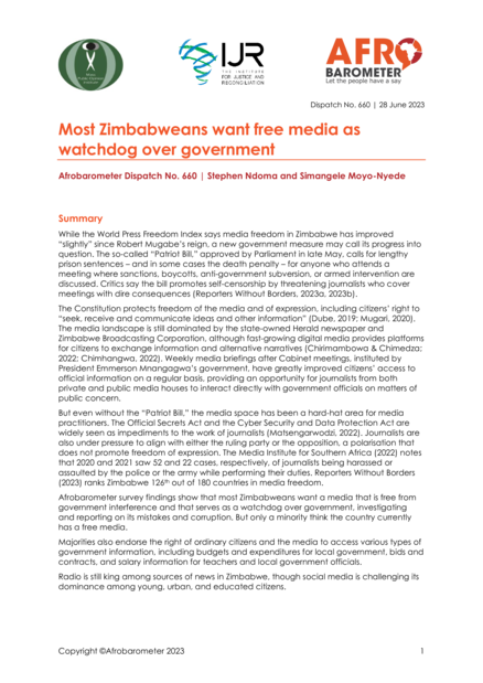 "The survey data show that most Zimbabweans treasure a media that is free from the shackles of government interference and that acts as a watchdog over government, investigating and reporting on its mistakes and corruption. Despite this dominant preference, only a minority think the country currently has a free media, suggesting that citizens want the government to do more to ensure that journalists can deliver on their mandate freely and safely. Majorities also endorse the right of ordinary citizens and the media to access various types of government information, including budgets and expenditures for local government, bids and contracts, and salary information for teachers and local government officials. As for where Zimbabweans obtain their news, radio still rules the roost among news sources, though social media is challenging its dominance among young, urban, and educated citizens." (Conclusion)
