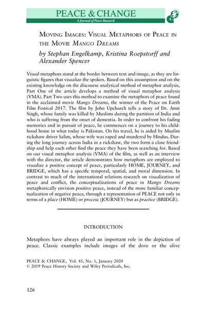 "Visual metaphors stand at the border between text and image, as they are linguistic figures that visualize the spoken. Based on this assumption and on the existing knowledge on the discourse analytical method of metaphor analysis, Part One of the article develops a method of visual metaphor analysis (VMA). Part Two uses this method to examine the metaphors of peace found in the acclaimed movie Mango Dreams, the winner of the Peace on Earth Film Festival 2017. The film by John Upchurch tells a story of Dr. Amit Singh, whose family was killed by Muslims during the partition of India and who is suffering from the onset of dementia. In order to confront his fading memories and in pursuit of peace, he commences on a journey to his childhood home in what today is Pakistan. On his travel, he is aided by Muslim rickshaw driver Salim, whose wife was raped and murdered by Hindus. During the long journey across India in a rickshaw, the two form a close friendship and help each other find the peace they have been searching for. Based on our visual metaphor analysis (VMA) of the film, as well as an interview with the director, the article demonstrates how metaphors are employed to visualize a positive concept of peace, particularly HOME, JOURNEY, and BRIDGE, which has a specific temporal, spatial, and moral dimension. In contrast to much of the international relations research on visualization of peace and conflict, the conceptualizations of peace in Mango Dreams metaphorically envision positive peace, instead of the more familiar conceptualization of negative peace, through a representation of PEACE not only in terms of a place (HOME) or process (JOURNEY) but as practice (BRIDGE)." (Abstract)