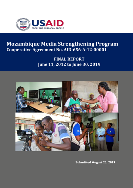 "This Mozambique Media Strengthening Program (MSP) final report is an overview of IREX’s implementation of a wide range of assistance activities to strengthen the media and healthrelated communications sectors in Mozambique over a seven-year period. These activities have significantly contributed to a free, open, diverse Mozambican media sector providing high quality information to citizens that promotes debate, accountability and development. Within the context of media strengthening, MSP focused on five thematic subject areas with some minor additions and modifications: (a) health and nutrition (HN), (b) gender, (c) human trafficking, (d) environment (umbrella term for biodiversity/wildlife trafficking/conservation/climate change) and (e) accountability and transparency, as well as on investigative journalism as a cross-cutting theme. While all themes were addressed at different times and in different contexts, in 2017, HN became a predominant theme. This integrated approach involved subject-specific HN communications training. What distinguished MSP from a pure HN project was the continued focus on building expertise in reporting on substantive subject matters, as well as a media capacity building focus. By combining (a) the development of strong community-based communication and media skills in the program beneficiaries with (b) the knowledge and use of simple, but effective HN messages, the program greatly increased its effectiveness, as it enabled and empowered program beneficiaries to continue to develop their own communication solutions (e.g., how to design a particular radio program) based on the messages and knowledge beneficiaries gained. While the successes of this program abound, there is much still to accomplish in supporting the media and communications actors and enacting a reorientation towards a true selfreliance of the sector led by local organizations through local strategy, local decision making and harnessing local revenue streams." (Executive summary)