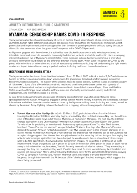 "The Myanmar authorities should immediately lift curbs on the free flow of information to at-risk communities; ensure journalists, human rights defenders and activists can operate freely and without any harassment, intimidation, arrest, prosecution and imprisonment; and encourage rather than threaten to punish people who criticize, openly discuss, or attempt to raise awareness about the government’s response to the COVID-19 pandemic. As Myanmar grapples with the outbreak, the authorities have blocked independent media websites; continued to intimidate, arrest and prosecute journalists, human rights defenders, activists and artists; and kept in place a sweeping internet shutdown in two of Myanmar’s poorest states. These measures indicate harsher censorship at a time when access to information could literally be the difference between life and death. When states’ responses to COVID-19 are paired with restrictions on information and a lack of transparency and censorship, they risk undermining the right to seek, receive and impart information on many important matters, including health and humanitarian issues." (Page 1)