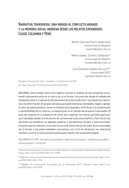 "Este trabajo tiene como objetivo central el análisis de dos proyectos transmedia latinoamericanos en el marco de la no ficción, circunscritos desde el método del estudio de casos y la aplicación de elementos de la teoría del actor-red, donde las relaciones, la conformación de grupos sociales que experimentaron realidades, llegan a gestar el valor de agenciamiento, como un enfoque que expande y contribuye a la comprensión y sostenibilidad de la historia y la experiencia en el tiempo del proyecto transmedia. El nivel de impacto en la audiencia de estos dos sistemas narrativos [Proyecto Quipu, Peru; Proyecto 4Ríos, Colombia] permitió apuntalar sus realidades desde la articulación de acciones de lucha social dentro y fuera de la red, ubicando sus temáticas en agendas políticas y periodísticas locales e internacionales. Impactos que se retoman a la luz de las características de los formatos de la transmedia de no ficción y sus potencialidades cocreativas, con el fin de dinamizar las relaciones sociales y activar la comunicación participativa dentro del ecosistema digital." (Resumen)