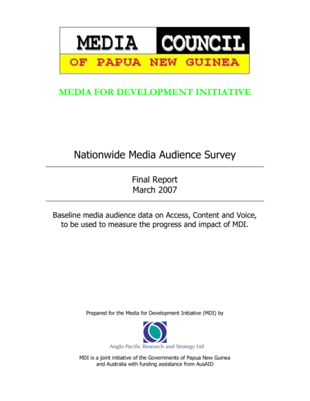"This Nationwide Media Audience Survey 2006 is the most comprehensive and representative media survey carried out in Papua New Guinea to date. Regular media surveys for commercial purposes have been carried out, concentrating on urban and peri-urban samples in the five most-developed major centres. Whilst their design is well suited to their objectives, the results are by no means representative of the population at large and the findings of this NMAS are obviously at considerable variance with such urban-centred surveys. This NMAS was designed to provide a more accurate ‘warts and all’ model of media reception, perceptions and attitudes across the nation. The sampling system catered for the majority rural population and less-developed provinces and districts. This NMAS clearly reveals the patterns of media gradients and the extent to which the majority rural populations are disadvantaged in receiving mass-media communications (and in interacting with the media)." (Executive summary, page 9)