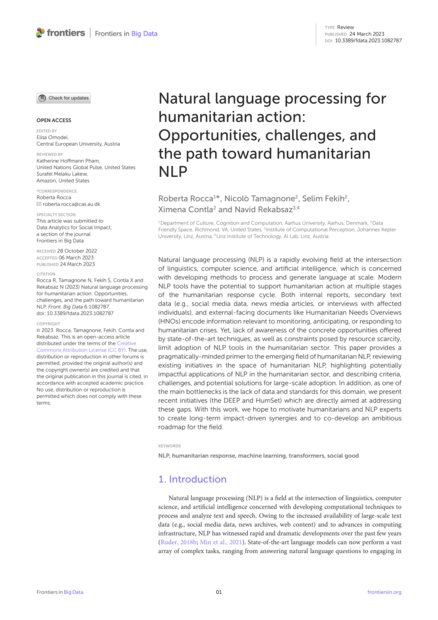 "Natural language processing (NLP) is a rapidly evolving field at the intersection of linguistics, computer science, and artificial intelligence, which is concerned with developing methods to process and generate language at scale. Modern NLP tools have the potential to support humanitarian action at multiple stages of the humanitarian response cycle. Both internal reports, secondary text data (e.g., social media data, news media articles, or interviews with affected individuals), and external-facing documents like Humanitarian Needs Overviews (HNOs) encode information relevant to monitoring, anticipating, or responding to humanitarian crises. Yet, lack of awareness of the concrete opportunities o..ered by state-of-the-art techniques, as well as constraints posed by resource scarcity, limit adoption of NLP tools in the humanitarian sector. This paper provides a pragmatically-minded primer to the emerging field of humanitarian NLP, reviewing existing initiatives in the space of humanitarian NLP, highlighting potentially impactful applications of NLP in the humanitarian sector, and describing criteria, challenges, and potential solutions for large-scale adoption. In addition, as one of the main bottlenecks is the lack of data and standards for this domain, we present recent initiatives (the DEEP and HumSet) which are directly aimed at addressing these gaps. With this work, we hope to motivate humanitarians and NLP experts to create long-term impact-driven synergies and to co-develop an ambitious roadmap for the field." (Abstract)