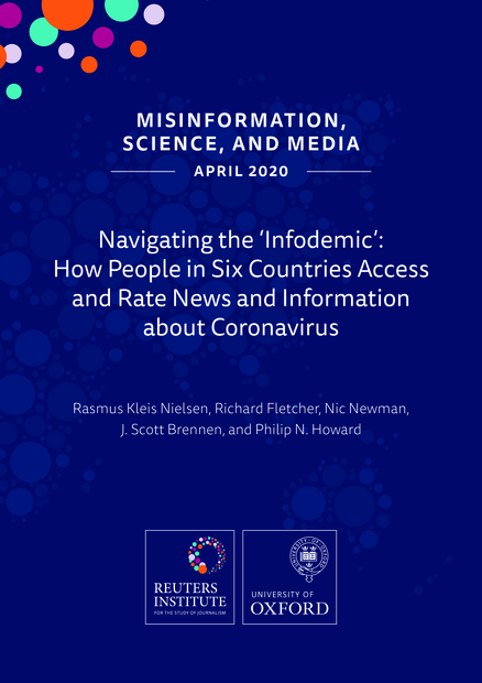 "In this report, we use survey data collected in late March and early April 2020 to document and understand how people in six countries (Argentina, Germany, South Korea, Spain, the UK, and the US) accessed news and information about COVID-19 in the early stages of the global pandemic, how they rate the trustworthiness of the different sources and platforms they rely on, how much misinformation they say they encounter, and their knowledge of and responses to the coronavirus crisis. We show that news use is up across all six countries, and most people in most countries are using either social media, search engines, video sites, and messaging applications (or combinations of these) to get news and information about coronavirus. In all six countries, people with low levels of formal education are much less likely to say that they rely on news organisations for news and information about coronavirus, and more likely to rely on social media and messaging applications. In Argentina, South Korea, Spain, and the US, young people are much more likely to rely on social media, and in Germany, the UK, and the US, to rely on messaging applications groups." (Executive summary)