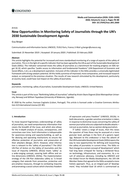 "This article highlights the potential for increased and more standardised monitoring of a range of aspects of the safety of journalists. This is in the light of a specific indicator that has been agreed by the UN as part of the Sustainable Development Goals (SDGs). The indicator concerned treats the safety of journalists as a benchmark for tracking progress on SDG target 16.10, which specifies "public access to information and fundamental freedoms" (UN Department of Economic and Social Affairs, n.d.), as a development aspiration. Inclusion of this indicator in the SDGs provides a universally legitimated framework with strong catalytic potential. All this holds a promise of improved, more comparative, and increased research output, as compared to the previous situation. The results of new research stimulated by this development, particularly at country level, could have real impact on the safety of journalists." (Abstract)