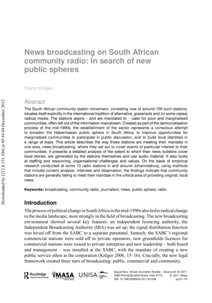 "The South African community station movement, consisting now of around 100 such stations, situates itself explicitly in the international tradition of alternative, grassroots and (in some cases) radical media. The stations aspire - and are mandated to - cater for poor and marginalised communities, often left out of the information mainstream. Created as part of the democratisation process of the mid-1990s, the establishment of the sector represents a conscious attempt to broaden the Habermasian public sphere in South Africa, to improve opportunities for marginalised communities to participate in public discussion, and to build local identities in a range of ways. This article describes the way these stations are meeting their mandate in one area, news broadcasting, where they set out to cover events of particular interest to their communities. It presents a detailed analysis of the extent to which their news bullteins cover local stories, are generated by the stations themselves and use audio material. It also looks at staffing and resourcing, organisational challenges and values. On the basis of empirical research conducted at some 13 radio stations in and around Johannesburg, using methods that include content analysis, interview and observation, the findings indicate that community stations are generally failing to meet their mandate in the critical area of providing original, local news." (Abstract)