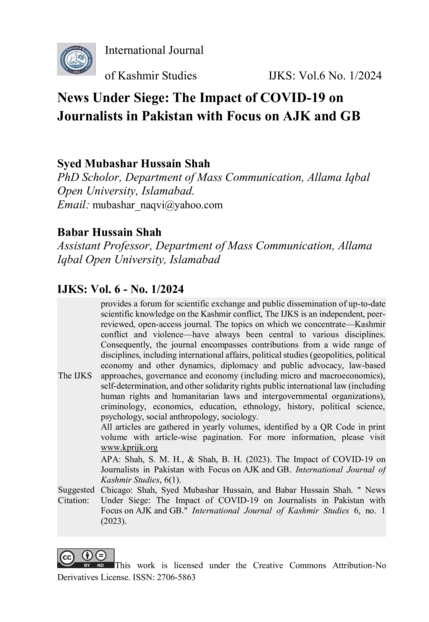 "This study investigates the experiences of journalists during COVID-19 pandemic from Azad Jammu and Kashmir (AJK) and Gilgit-Baltistan (GB) through a series of focus group discussions (FGDs). The research aims to develop strategies for enhancing journalists' capabilities and well-being in anticipation of future pandemics. The FGDs involved seasoned journalists from central press clubs in all regions, who provided insights into the challenges they faced and the strategies they adopted during the COVID-19 pandemic. Thematic analysis, conducted using NVivo software, revealed eight key themes related to the pandemic's impact on journalism. These themes informed a set of consolidated recommendations designed to improve journalists' safety, mental health, and access to information. The recommendations also emphasize strengthening legal protections, creating capacity-building opportunities, fostering networking and collaboration, and implementing specialized health reporting training. By addressing these recommendations, the study proposes a framework to bolster journalists' resilience and effectiveness in navigating future crises." (Abstract)
