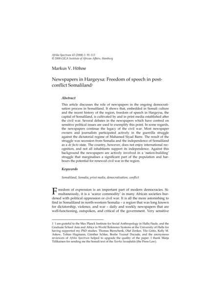 "This article discusses the role of newspapers in the ongoing democratisation process in Somaliland. It shows that, embedded in Somali culture and the recent history of the region, freedom of speech in Hargeysa, the capital of Somaliland, is cultivated by and in print media established after the civil war. Several debates in the newspapers which have centred on sensitive political issues are used to exemplify this point. In some regards, the newspapers continue the legacy of the civil war. Most newspaper owners and journalists participated actively in the guerrilla struggle against the dictatorial regime of Mahamed Siyad Barre. The result of the struggle was secession from Somalia and the independence of Somaliland as a de facto state. The country, however, does not enjoy international recognition, and not all inhabitants support its independence. Against this background the newspapers are actively involved in a ‘nation-building’ struggle that marginalises a significant part of the population and harbours the potential for renewed civil war in the region." (Abstract)