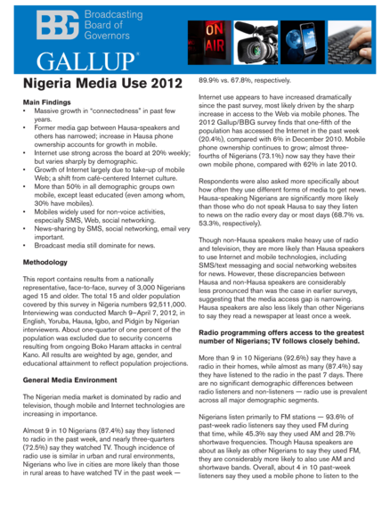 "The Nigerian media market is dominated by radio and television, though mobile and Internet technologies are increasing in importance. Almost 9 in 10 Nigerians (87.4%) say they listened to radio in the past week, and nearly three-quarters (72.5%) say they watched TV. Though incidence of radio use is similar in urban and rural environments, Nigerians who live in cities are more likely than those in rural areas to have watched TV in the past week —89.9% vs. 67.8%, respectively. Internet use appears to have increased dramatically since the past survey, most likely driven by the sharp increase in access to the Web via mobile phones. The 2012 Gallup/BBG survey finds that one-fifth of the population has accessed the Internet in the past week (20.4%), compared with 6% in December 2010. Mobile phone ownership continues to grow; almost three-fourths of Nigerians (73.1%) now say they have their own mobile phone, compared with 62% in late 2010. Respondents were also asked more specifically about how often they use different forms of media to get news. Hausa-speaking Nigerians are significantly more likely than those who do not speak Hausa to say they listen to news on the radio every day or most days (68.7% vs. 53.3%, respectively). Though non-Hausa speakers make heavy use of radio and television, they are more likely than Hausa speakers to use Internet and mobile technologies, including SMS/text messaging and social networking websites for news. However, these discrepancies between Hausa and non-Hausa speakers are considerably less pronounced than was the case in earlier surveys, suggesting that the media access gap is narrowing." (Page 1)