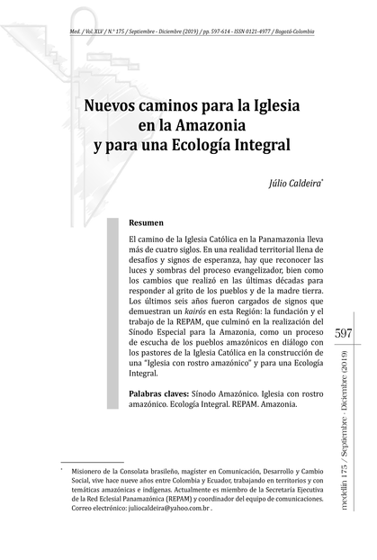 "El camino de la Iglesia Católica en la Panamazonia lleva más de cuatro siglos. En una realidad territorial llena de desafíos y signos de esperanza, hay que reconocer las luces y sombras del proceso evangelizador, bien como los cambios que realizó en las últimas décadas para responder al grito de los pueblos y de la madre tierra. Los últimos seis años fueron cargados de signos que demuestran un kairós en esta Región: la fundación y el trabajo de la REPAM, que culminó en la realización del Sínodo Especial para la Amazonia, como un proceso de escucha de los pueblos amazónicos en diálogo con los pastores de la Iglesia Católica en la construcción de una “Iglesia con rostro amazónico” y para una Ecología Integral." (Resumen)