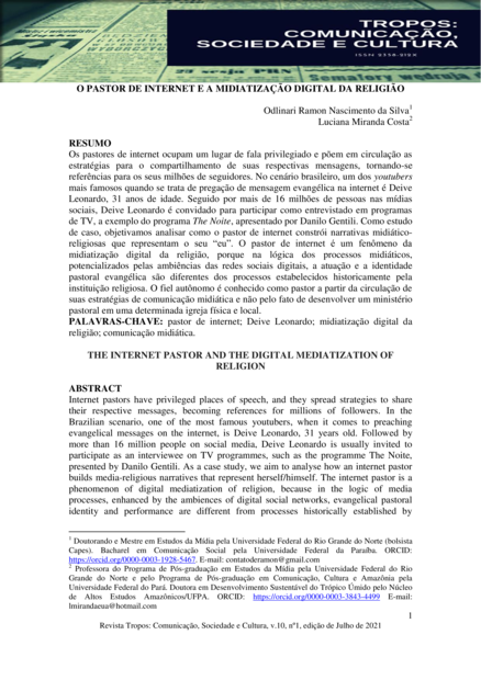"Os pastores de internet ocupam um lugar de fala privilegiado e põem em circulação as estratégias para o compartilhamento de suas respectivas mensagens, tornando-se referências para os seus milhões de seguidores. No cenário brasileiro, um dos youtubers mais famosos quando se trata de pregação de mensagem evangélica na internet é Deive Leonardo, 31 anos de idade. Seguido por mais de 16 milhões de pessoas nas mídias sociais, Deive Leonardo é convidado para participar como entrevistado em programas de TV, a exemplo do programa The Noite, apresentado por Danilo Gentili. Como estudo de caso, objetivamos analisar como o pastor de internet constrói narrativas midiático-religiosas que representam o seu “eu”. O pastor de internet é um fenômeno da midiatização digital da religião, porque na lógica dos processos midiáticos, potencializados pelas ambiências das redes sociais digitais, a atuação e a identidade pastoral evangélica são diferentes dos processos estabelecidos historicamente pela instituição religiosa. O fiel autônomo é conhecido como pastor a partir da circulação de suas estratégias de comunicação midiática e não pelo fato de desenvolver um ministério pastoral em uma determinada igreja física e local." (Abstract)