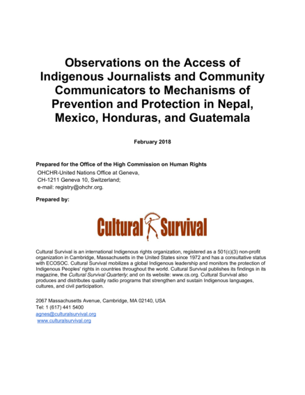 "This reports examines the situation of freedom of expression of indigenous journalists in four countries and analyzes data, where available, of Indigenous Peoples’ access to mechanisms charged with ensuring their safety. We present grassroots information from Nepal in English, and from Guatemala, Honduras, and Mexico in Spanish, along with general recommendations for improving the specific experience of Indigenous journalists and community communicators. Please note this information is far from exhaustive and represents only situations that were brought to this organization’s attention." (Introduction, page 1)