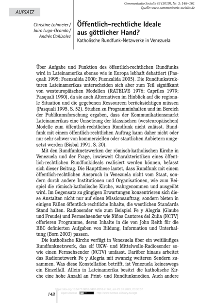 "Mit den Rundfunknetzwerken der römisch-katholischen Kirche in Venezuela und der Frage, inwieweit Charakteristiken eines öffentlich-rechtlichen Rundfunkideals realisiert werden können, befasst sich dieser Beitrag. Die Hauptthese lautet, dass Rundfunk mit einem öffentlich-rechtlichen Anspruch in Venezuela nicht vom Staat, sondern durch andere Institutionen und Organisationen, wie zum Beispiel die römisch-katholische Kirche, wahrgenommen und ausgeübt wird. Im Gegensatz zu gängigen Erwartungen konzentrieren sich diese Anstalten nicht nur auf einen Missionsauftrag, sondern bieten in einigen Fällen öffentlich-rechtliche Inhalte, die westlichen Standards Stand halten. Radiosender wie zum Beispiel Fe y Alegría (Glaube und Freude) und Fernsehsender wie Niños Cantores del Zulia (NCTV) offerieren Programme, deren Inhalte in die von John Reith für die BBC definierten Aufgaben von Bildung, Information und Unterhaltung passen. Die katholische Kirche verfügt in Venezuela über ein weitläufiges Rundfunknetzwerk, das elf UKW- und Mittelwelle-Radiosender sowie einen Fernsehsender (NCTV) umfasst. Darüber hinaus arbeitet das Radionetzwerk Fe y Alegría mit zwanzig weiteren Sendern zusammen. Was diese Konstellation betrifft, ist Venezuela keineswegs ein Einzelfall. Allein in Lateinamerika besitzt die katholische Kirche eine hohe Anzahl an Print- und Rundfunkmedien. Auch andere mediale Unternehmungen wie familienorientierte Theater und Medien auf kommunaler Ebene gehören ihr oder werden finanziell unterstützt. In Bolivien galt die katholische Nachrichtenagentur Fides für lange Zeit als eine der wenigen glaubwürdigen Quellen. Dies trifft ebenso auf den chilenischen Fernsehsender Kanal 13 zu, der sich im Besitz der katholischen Kirche befindet. Allerdings scheinen öffentlich-rechtliche Inhalte vor allem in Venezuela umgesetzt zu werden. Radiostationen wie Fe y Alegría und La Voz de la Fe und Fernsehsender wie Niños Cantores del Zulia waren und sind auch heute noch von entscheidender Bedeutung im Hinblick auf die Umsetzung öffentlich-rechtlicher Rundfunkideale. Sie bringen familienorientierte Programme, fördern eine gemeinsame, landesweite Wertevorstellung, unterstützten Tausende (wenn nicht Hunderttausende) beim Erlernen von Lesen und Schreiben und vermitteln Wissen darüber, wie man das Land bearbeitet und ausgewogen und gesünder lebt." (Seite 148-149)